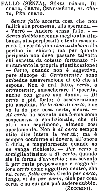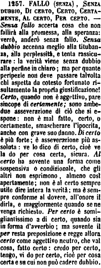 Fallo (senza), Senza dubbio, Di certo, Certo, Certamente, Al certo, Per certo - Senza fallo accerta cosa che non fallirà alla promessa, alla speranza. - «Verrò - Anderò senza fallo.» - Senza dubbio accenna meglio alla titubanza, alla perplessità e tenta rassicurare. La verità viene senza dubbio alla perfine in chiaro; ma per quante peripezie non deve passare talvolta chi aspetta da cotesto fortunato risultamento la propria giustificazione! - Certo, quando non è aggettivo, pare sincope di Certamente; sono ambedue asseverazione di ciò che si espone. Non è mal fatto, certo, o certamente, smascherare l'ipocrita, anche con grave suo danno. - Di certo è più forte; è asseverazione più assoluta. Ve lo dico di certo, cioè ve la do per cosa certa, sicura. - Al certo ha sovente una forma come sospensiva o condizionale, che gli altri non esprimono, almeno così apertamente. Non è al certo sempre utile dire intera la verità; ma è sempre conforme al dovere, all'onore il dirla, e maggiormente quando se ne venga richiesto. - Per certo è somigliantissimo a di certo, quando sia in forma d'avverbio; ma sovente il per resta preposizione e regge allora certo come aggettivo neutro, che val cosa, fatto certo. Credo per certo, tengo, vi do per certo, cioè per cosa certa e su cui non può cadere dubbio.
