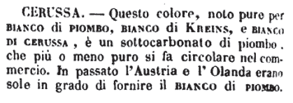 | Cerussa - Questo colore, noto pure per bianco di piombo, bianco di Kreins, e bianco di cerussa, è un sottocarbonato di piombo che più o meno puro si fa circolare nel commercio. In passato l'Austria e l'Olanda erano sole in grado di fornire il bianco di piombo. [immagine] |