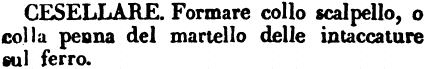 | Cesellare - Formare collo scalpello, o colla penna del martello delle intaccature sul ferro. [immagine] |