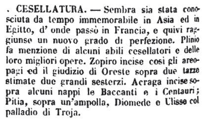 | Cesellatura - Sembra sia stata conosciuta da tempo immemorabile in Asia ed in Egitto, d'onde passò in Francia, e quivi raggiunse un nuovo grado di perfezione. Plinio fa menzione di alcuni abili cesellatori e delle loro migliori opere. Zopiro incise così gli areopagi ed il giudizio di Oreste sopra due tazze stimate due grandi sesterzi. Acraga incise sopra alcuni nappi le Baccanti e i Centauri; Pitia, sopra un'ampolla, Diomede e Ulisse col palladio di Troja. [immagine] |