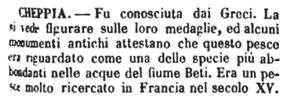 | Cheppia - Fu conosciuta dai Greci. La si vede figurare sulle loro medaglie, ed alcuni monumenti antichi attestano che questo pesce era riguardato come una delle specie più abbondanti nelle acque del fiume Beti. Era un pesce molto ricercato in Francia nel secolo XV. [immagine] |