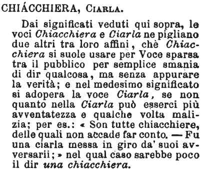 | Chiacchiera, Ciarla - Dai significati veduti qui sopra, le voci Chiacchiera e Ciarla ne pigliano due altri tra loro affini, chè Chiacchiera si suole usare per Voce sparsa tra il pubblico per semplice smania di dir qualcosa, ma senza appurare la verità; e nel medesimo significato si adopera la voce Ciarla, se non quanto nella Ciarla può esserci più avventatezza e qualche volta malizia; per es.: « Son tutte chiacchiere, delle quali non accade far conto. - Fu una ciarla messa in giro da' suoi avversarii; » nel qual caso sarebbe poco il dir una chiacchiera. [immagine] |