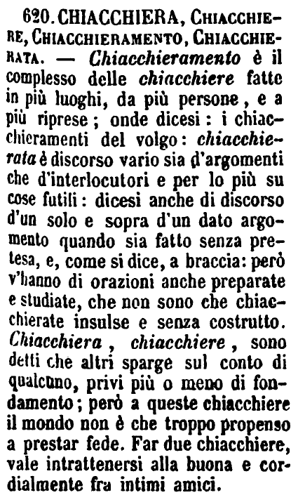 | Chiacchiera, Chiacchiere, Chiacchieramento, Chiacchierata - Chiacchieramento è il complesso delle chiacchiere fatte in più luoghi, da più persone, e a più riprese; onde dicesi: i chiacchieramenti del volgo: chiacchierata è discorso vario sia d'argomenti che d'interlecutori e per lo più su cose futili: dicesi anche di discorso d'un solo e sopra d'un dato argomento quando sia fatto senza pretesa, e, come si dice, a braccia: però v'hanno di orazioni anche preparate e studiate, che non sono che chiacchierate insulse e senza costrutto. Chiacchiera, chiacchiere, sono detti che altri sparge sul conto di qualcuno, privi più o meno di fondamento; però a queste chiacchiere il mondo non è che troppo propenso a prestar fede. Far due chiacchiere, vale intrattenersi alla buona e cordialmente fra intimi amici. [immagine] |