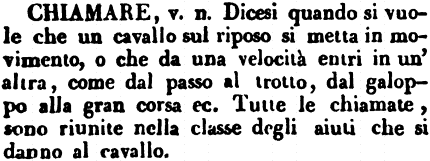 | Chiamare - v. n. Dicesi quando si vuole che un cavallo sul riposo si metta in movimento, o che da una velocità entri in un'altra, come dal passo al trotto, dal galoppo alla gran corsa ec. Tutte le chiamate, sono riunite nella classe degli aiuti che si danno al cavallo. [immagine] |