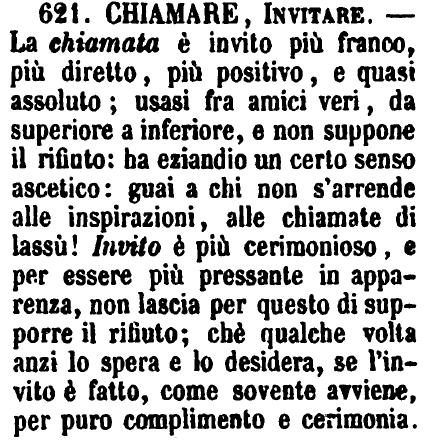 | Chiamare, Invitare - La chiamata è invito più franco, più diretto, più positivo, e quasi assoluto; usasi fra amici veri, da superiore a inferiore, e non suppone il rifiuto: ha eziandio un certo senso ascetico: guai a chi non s'arrende alle inspirazioni, alle chiamate di lassù! Invito è più cerimonioso, e per essere più pressante in apparenza, non lascia per questo di supporre il rifiuto; chè qualche volta anzi lo spera e lo desidera, se l'invito è fatto, come sovente avviene, per puro complimento e cerimonia. [immagine] |