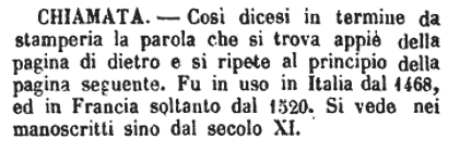 | Chiamata - Così dicesi in termine da stamperia la parola che si trova appiè della pagina di dietro e si ripete al principio della pagina seguente. Fu in uso in Italia dal 1468, ed in Francia soltanto dal 1520. Si vede nei manoscritti sino dal secolo XI. [immagine] |