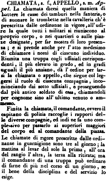 | Chiamata, s. f., Appello, s. m. - Appel. La chiamata dicesi quella maniera di battere le casse dei tamburi nella fanteria, o di suonare le trombette nella cavalleria ch'è prescritta dalle ordinanze in vigore, all'udire la quale tutti i militari si riuniscono al proprio corpo, o nei quartieri o sulle piazze designate, per far mostra di loro presenza; e si prende anche per l'atto medesimo di chiamare i nomi di ciascuno individuo. Riunita una truppa cogli uffiziali corrispondenti, il più elevato in grado, ed in gradi uguali il più anziano, dà l'ordine per farsi la chiamata o appello, che siegue col leggersi il ruolo di ciascuna compagnia, incominciando dai sotto uffiziali, e proseguendo dal più antico soldato di essa, chiamandoli per cognome sino all'ultimo venuto o ammesso.
