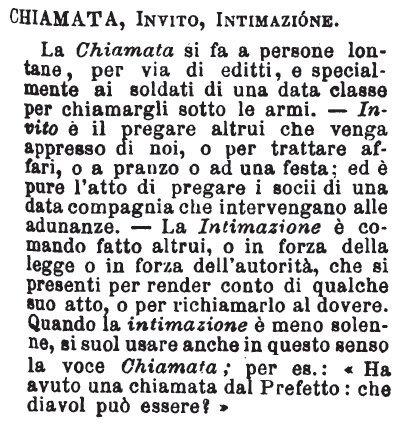 | Chiamata, Invito, Intimazione - La Chiamata si fa a persone lontane, per via di editti, e specialmente ai soldati di una data classe per chiamargli sotto le armi. - Invito è il pregare altrui che venga appresso di noi, o per trattare affari, o a pranzo o ad una festa; ed è pure l'atto di pregare i socii di una data compagnia che intervengano alle adunanze. - La Intimazione è comando fatto altrui, o in forza della legge o in forza dell'autorità, che si presenti per render conto di qualche suo atto, o per richiamarlo al dovere. Quando la intimazione è meno solenne, si suol usare anche in questo senso la voce Chiamata; per es.: « Ha avuto una chiamata dal Prefetto: che diavol può essere? » [immagine] |