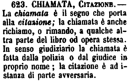 | Chiamata, Citazione - La chiamata è il segno che porta alla citazione; la chiamata è anche richiamo, o rimando, a qualche altra parte del libro od opera stessa. In senso giudiziario la chiamata è fatta dalla polizia o dal giudice in proprio nome; la citazione è ad istanza di parte avversaria. [immagine] |