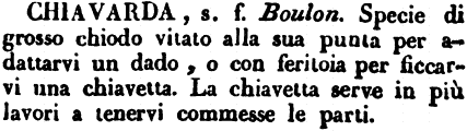 | Chiavarda - s. f. Boulon. Specie di grosso chiodo vitato alla sua punta per adattarvi un dado, o con feritoia per ficcarvi una chiavetta. La chiavetta serve in più lavori a tenervi commesse le parti. [immagine] |