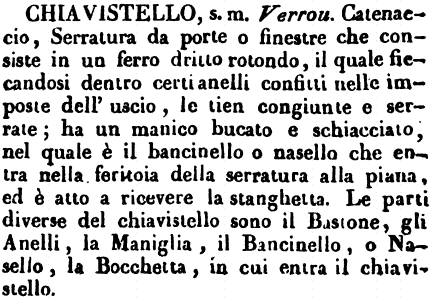 | Chiavistello - S. m. Catenaccio, Strumento di ferro lungo e tondo, il quale ficcandosi dentro a certi anelli confitti nelle imposte dell'uscio, le tien congiunte e serrate, ed ha per lo più un manico dall'uno de' lati bucato e schiacciato, nel quale è il boncinello, per ricever la stanghetta della toppa. T. Non da Chiave, ma da Claudo. E Chiavistello può essere con chiave e senza. = Cr. 1. 7. 2. (C) Si facciano… porte nobili o rustiche…, purchè di notte si possano serrare con chiavistelli, o chiavi di ferro. Mor. S. Greg. lo posi il chiavistello alle porte, e dissi. Virg. Eneid. Dov'erano le porte di ferro con cento chiavistelli. Lasc. Cen. 1. nov. 7. 144. (Mt.) Il fiorentino… si cacciò… alla volta della porta principale che riusciva in sulla piazza, e di fatto cavatone il chiavistello, l'aperse. [Val.] Fortig. Ricciard. 26. 60. Unge bel bello Della grotta ogni toppa e chiavistello.