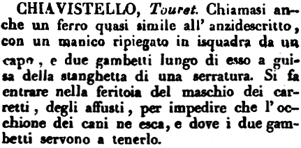 | Chiavistello - Touret. Chiamasi anche un ferro quasi simile all'anzidescritto, con un manico ripiegato in isquadra da un capo, e due gambetti lungo di esso a guisa della stanghetta di una serratura. Si fa entrare nella feritoia del maschio dei carretti, degli affusti, per impedire che l'occhione dei cani ne esca, e dove i due gambetti servono a tenerlo. [immagine] |
