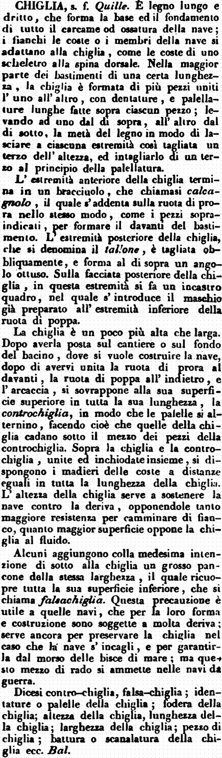 | Chiglia - s. f. Quille. È legno lungo e dritto, che forma la base ed il fondamento di tutto il carcame od ossatura della nave; i fianchi le coste o i membri della nave si adattano alla chiglia, come le coste di uno scheletro alla spina dorsale. Nella maggior parte dei bastimenti di una certa lunghezza, la chiglia è formata di più pezzi uniti l'uno all'altro, con dentature, e palellature lunghe fatte sopra ciascun pezzo; levando ad uno dal di sopra, all'altro dal di sotto, la metà del legno in modo di lasciare a ciascuna estremità così tagliata un terzo dell'altezza, ed intagliarlo di un terzo al principio della palellatura.