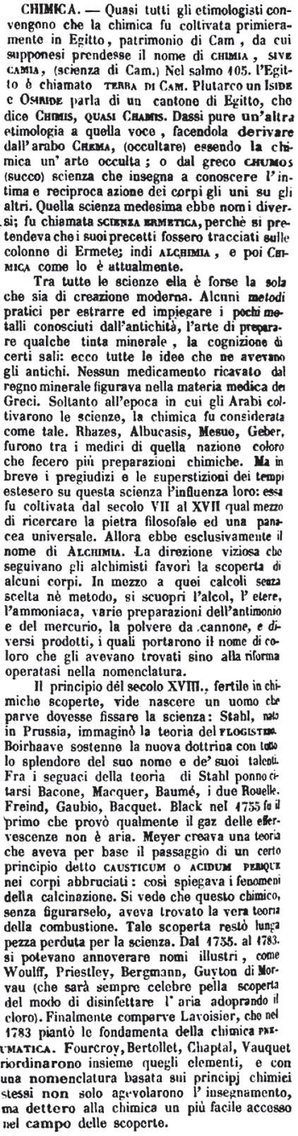 | Chimica - Quasi tutti gli etimologisti convengono che la chimica fu coltivata primieramente in Egitto, patrimonio di Cam, da cui supponesi prendesse il nome di chimia, sive camia, (scienza di Cam.) Nel salmo 105. l'Egitto è chiamato terra di Cam. Plutarco in Iside e Osiride parla di un cantone di Egitto, che dice Chimis, quasi Chamis. Dassi pure un’altra etimologia a quella voce, facendola derivare dall’arabo Chema, (occultare) essendo la chimica un’arte occulta; o dal greco chumos (succo) scienza che insegna a conoscere l’intima e reciproca azione dei corpi gli uni su gli altri. Quella scienza medesima ebbe nomi diversi: fu chiamata scienza ermetica, perché si pretendeva che i suoi precetti fossero tracciati sulle colonne di Ermete; indi alchimia, e poi Chimica come lo è attualmente.