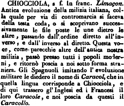 | Chiocciola - s f. In franc. Limaçon. Antica evoluzione della milizia italiana, colla quale per via di contromarcia si faceva della testa coda, o si scoprivano successivamente le file poste le une dietro le altre, passando dall'ordine diretto all'inverso, e dall'inverso al diretto. Questa voce, come parecchie altre dell'antica nostra milizia, passò presso tutti i popoli moderni, e ritornò poscia a noi sotto forma straniera. Gli Spagnuoli imitando l'evoluzione militare le diedero il nome di Caracol, che in quella lingua corrisponde a Chiocciola, e di qui trassero gl'Inglesi ed i Francesi il loro Caracole, e noi poscia da questi il Caracollo. [immagine] |