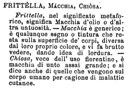 | Frittella, Macchia, Chiosa - Frittella, nel significato metaforico, significa Macchia d'olio o d'altra untuosità. - Macchia è generico; è qualunque segno o tintura che resta sulla superficie de' corpi, diversa dal loro proprio colore, e vi fa brutto vedere, dando idea di lordura. - Chiosa, voce dell'uso fiorentino, è macchia di unto assai grande; e si dice anche di quelle che vengono sul corpo umano per cagione di malattie cutanee. [immagine] |