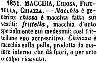| Macchia, Chiosa, Frittella, Chiazza - Macchia è generico: chiosa è macchia fatta sui vestiti: frittella, macchia d'unto specialmente sui medesimi; così frittellone suo accrescitivo. Chiazza è macchia sulla pelle, prodotta da malore interno che dà fuori, o per urto o colpo ricevuto. [immagine] |