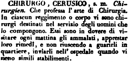 | Chirurgo, Cerusico - Il Chirurgo è assai più nobile voce che Cerusico: esso è colui che fa tutte quante le operazioni dell'arte salutare, il che richiede studio lungo, lunga pratica e singolare perizia. - Il Cerusico invece è quello che si sta contento alle così dette operazioni di bassa chirurgia, come far salassi, attaccar mignatte, applicare impiastri e cerotti. Ora si va facendo più raro l'uso di questa seconda voce. [immagine] |