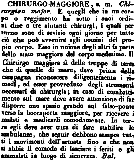 | Chirurgo maggiore - s. m. Chirurgien major. È quegli che in un corpo o reggimento ha sotto i suoi ordini due o tre aiutanti chirurgi, i quali per turno sono di servizio ogni giorno per tutto ciò che può avvenire agli uomini del proprio corpo. Esso in unione degli altri fa parte dello stato maggiore del corpo medesimo. Il Chirurgo maggiore sì delle truppe di terra che di quelle di mare, deve prima della campagna riconoscere diligentemente i rimedî, ed esser provveduto degli strumenti necessarî di chirurgia; in caso di combattimento sul mare deve avere attenzione di far disporre uno spazio grande sul falso-ponte verso la boccaporta maggiore, per ricevere i malati e medicarli comodamente. In terra egli deve aver cura di fare stabilire le ambulanze, che seguir debbono sempre tutti i movimenti dell'armata fino a che non si abbia il comodo di lasciare i feriti e gli ammalati in luogo di sicurezza. Bal. [immagine] |