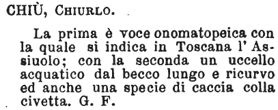| Chiù, Chiurlo - La prima è voce onomatopeica con la quale si indica in Toscana l'Assiuolo; con la seconda un uccello acquatico dal becco lungo e ricurvo ed anche una specie di caccia colla civetta. G.F. [immagine] |