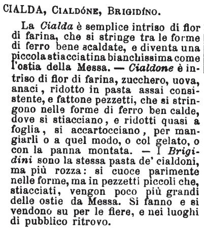 | Cialda, Cialdone, Brigidino - La Cialda è semplice intriso di fior di farina, che si stringe tra le forme di ferro bene scaldate, e diventa una piccola stiacciatina bianchissima come l'ostia della Messa. - Cialdone è intriso di fior di farina, zucchero, uova, anaci, ridotto in pasta assai consistente, e fattone pezzetti, che si stringono nelle forme di ferro ben calde, dove si stiacciano, e ridotti quasi a foglia, si accartocciano, per mangiarli o a quel modo, o col gelato, o con la panna montata. - I Brigidini sono la stessa pasta de' cialdoni, ma più rozza: si cuoce parimente nelle forme, ma in pezzetti piccoli che, stiacciati, vengon poco più grandi delle ostie da Messa. Si fanno e si vendono su per le fiere, e nei luoghi di pubblico ritrovo. [immagine] |
