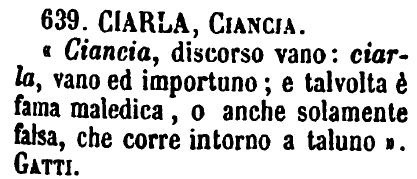 | Ciarla, Ciancia - «Ciancia, discorso vano: ciarla, vano ed importuno; e talvolta è fama maledica, o anche solamente falsa, che corre intorno a taluno». Gatti. [immagine] |