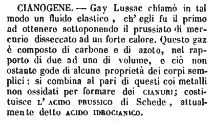 | Cianogene - Gay Lussac chiamò in tal modo un fluido elastico, ch'egli fu il primo ad ottenere sottoponendo il prussiato di mercurio disseccato ad un forte calore. Questo gaz è composto di carbone e di azoto, nel rapporto di due ad uno di volume, e ciò non ostante gode di alcune proprietà dei corpi semplici: si combina al pari di questi coi metalli non ossidati per formare dei cianuri; costituisce l'acido prussico di Schede, attualmente detto acido idrocianico. [immagine] |