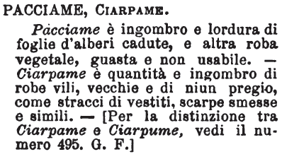 | Pacciame, Ciarpame - Pacciame è ingombro e lordura di foglie d'alberi cadute, e altra roba vegetale, guasta e non usabile. - Ciarpame è quantità e ingombro di robe vili, vecchie e di niun pregio, come stracci di vestiti, scarpe smesse e simili. - [Per la distinzione tra Ciarpame e Ciarpume, vedi il numero 495. G.F.] [immagine] |