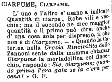 | Ciarpume, Ciarpame - L'uno e l'altro s'usano a indicare Quantità di ciarpe, Robe vili e vecchie; ma il secondo ne dice maggior quantità e il primo può dirsi anche d'una cosa sola per dispregio, il che non è di Ciarpame. - « Quando la Caterina nella Crezia Rincivilita dello Zannoni sente dalla mamma chiamar Ciarpume la mortadellina col finocchio, risponde: Sie, ciarpume; quando prima l'era gala se la c'era per cena! » G. F. [immagine] |