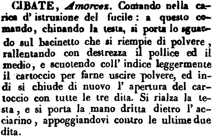 | Cibate - Amorcez. Comando nella carica d'istruzione del fucile: a questo comando, chinando la testa, si porta lo sguardo sul bacinetto che si riempie di polvere, rallentando con destrezza il pollice ed il medio, e scuotendo coll'indice leggermente il cartoccio per farne uscire polvere, ed indi si chiude di nuovo l'apertura del cartoccio con tutte le tre dita. Si rialza la testa, e si porta la mano dritta dietro l'acciarino, appoggiandovi contro le ultime due dita. [immagine] |
