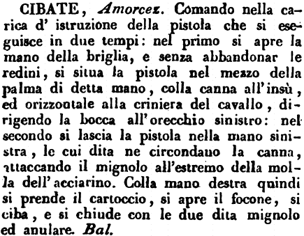 | Cibate - Amorcez. Comando nella carica d'istruzione della pistola che si eseguisce in due tempi: nel primo si apre la mano della briglia, e senza abbandonar le redini, si situa la pistola nel mezzo della palma di detta mano, colla canna all'insù, ed orizzontale alla criniera del cavallo, dirigendo la bocca all'orecchio sinistro: nel secondo si lascia la pistola nella mano sinistra, le cui dita ne circondano la canna, attaccando il mignolo all'estremo della molla dell'acciarino. Colla mano destra quindi si prende il cartoccio, si apre il focone, si ciba, e si chiude con le due dita mignolo ed anulare. Bal. [immagine] |