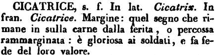 | Cicatrice - s. f. In lat. Cicatrix. In fran. Cicatrice. Margine: quel segno che rimane in sulla carne dalla ferita, o percossa rammarginata: è gloriosa ai soldati, e fa fede del loro valore. [immagine] |