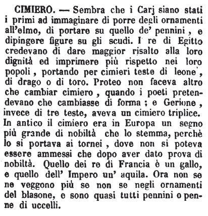 | Elmo, Cimiero - «Cimiero (cima) è il sommo dell'elmo, guarnito di divisa o di piume. G. Villani, lib. VII, cap. 9: «Manfredi, mettendosi l'elmo in testa, un'aquila d'argento che v'era su per cimiero, gli cadde in sull'arcione». Polidori.