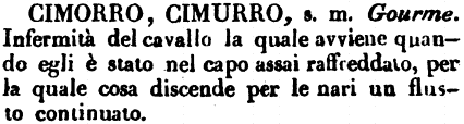 | Cimorro, Cimurro - s. m. Gourme. Infermità del cavallo la quale avviene quando egli è stato nel capo assai raffreddato, per la quale cosa discende per le nari un flusso continuato. [immagine] |