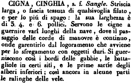| Cigna, Cinghia - s. f. Sangle. Striscia larga, o fascia tessuta di qualsivoglia filato, e per lo più di spago: la sua larghezza è di 3. 4. e 6. pollici. Servono le cigne a guernire vari luoghi della nave, dove il passaggio delle corde di manovre è continuo, onde garentirlo dal logoramento che avviene per lo sfregamento con oggetti duri. Si guerniscono così i bordi delle gabbie, le battagliole in certi siti, e le prime sartíe degli alberi inferiori; così ancora in alcune parti le ralinghe delle vele. [immagine] |