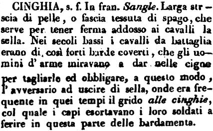 | Cinghia - s. f. In fran. Sangle. Larga striscia di pelle, o fascia tessuta di spago, che serve per tener ferma addosso ai cavalli la sella. Nei secoli bassi i cavalli da battaglia erano di così forti barde converti, che gli uomini d'arme miravano a dar nelle cigne per tagliarle ed obbligare, a questo modo, l'avversario ad uscire di sella, onde era frequente in quei tempi il grido alle cinghie, col quale i capi esortavano i loro soldati a ferire in questa parte delle bardamenta. [immagine] |
