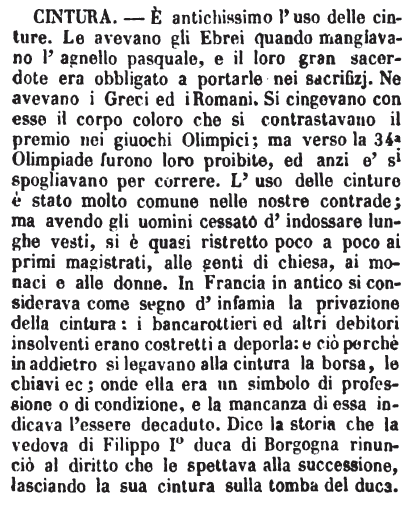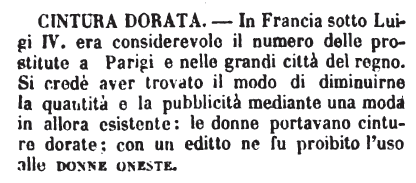 | Cintura dorata - In Francia sotto Luigi IV. era considerevole il numero delle prostitute a Parigi e nelle grandi città del regno. Si credè aver trovato il modo di diminuirne la quantità e la pubblicità mediante una moda in allora esistente: le donne portavano cinture dorate; con un editto ne fu proibito l'uso alle donne oneste. [immagine] |