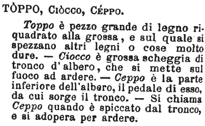| Toppo, Ciocco, Ceppo - Toppo è pezzo grande di legno riquadrato alla grossa, e sul quale si spezzano altri legni o cose molto dure. - Ciocco è grossa scheggia di tronco d'albero, che si mette sul fuoco ad ardere. - Ceppo è la parte inferiore dell'albero, il pedale di esso, da cui sorge il tronco. - Si chiama Ceppo quando è spiccato dal tronco, e si adopera per ardere. [immagine] |