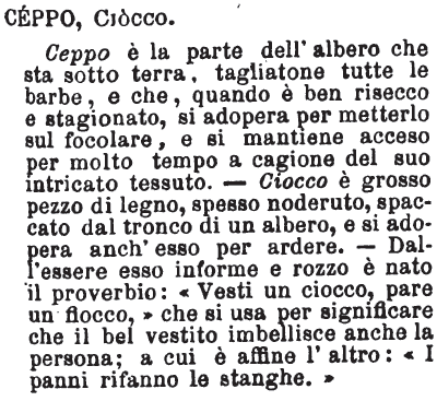 | Ceppo, Ciocco - Ceppo è la parte dell'albero che sta sotto terra, tagliatone tutte le barbe, e che, quando è ben risecco e stagionato, si adopera per metterlo sul focolare, e si mantiene acceso per molto tempo a cagione del suo intricato tessuto. - Ciocco è grosso pezzo di legno, spesso noderuto, spaccato dal tronco di un albero, e si adopera anch'esso per ardere. - Dall'essere esso informe e rozzo è nato il proverbio: «Vesti un ciocco, pare un fiocco,» che si usa per significare che il bel vestito imbellisce anche la persona; a cui è affine l'altro: «I panni rifanno le stanghe.» [immagine] |