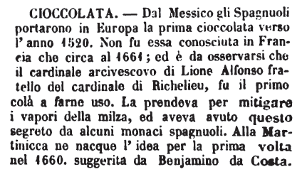| Cioccolata - Dal Messico gli Spagnuoli portarono in Europa la prima cioccolata verso l'anno 1520. Non fu essa conosciuta in Francia che circa al 1661; ed è da osservarsi che il cardinale arcivescovo di Lione Alfonso fratello del cardinale di Richelieu, fu il primo colà a farne uso. La prendeva per mitigare i vapori della milza, ed aveva avuto questo segreto da alcuni monaci spagnuoli. Alla Martinicca ne nacque l'idea per la prima volta nel 1660. suggerita da Benjamino da Costa. [immagine] |