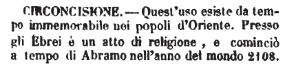 | Circoncisione - Quest'uso esiste da tempo immemorabile nei popoli d'Oriente. Presso gli Ebrei è un atto di religione, e cominciò a tempo di Abramo nell'anno del mondo 2108. [immagine] |