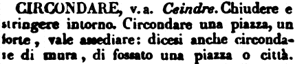| Circondare - v. a. Ceindre. Chiudere e stringere intorno. Circondare una piazza, un forte, vale assediare: dicesi anche circondare di mura, di fossato una piazza o città. [immagine] |
