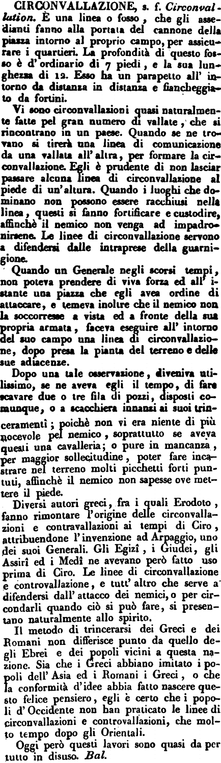| Circonvallazione - s. f. Circonvallation. È una linea o fosso, che gli assedianti fanno alla portata del cannone della piazza intorno al proprio campo, per assicurare i quartieri. La profondità di questo fosso è d'ordinario di 7 piedi, e la sua lunghezza di 12. Esso ha un parapetto all'intorno da distanza in distanza e fiancheggiato da fortini.