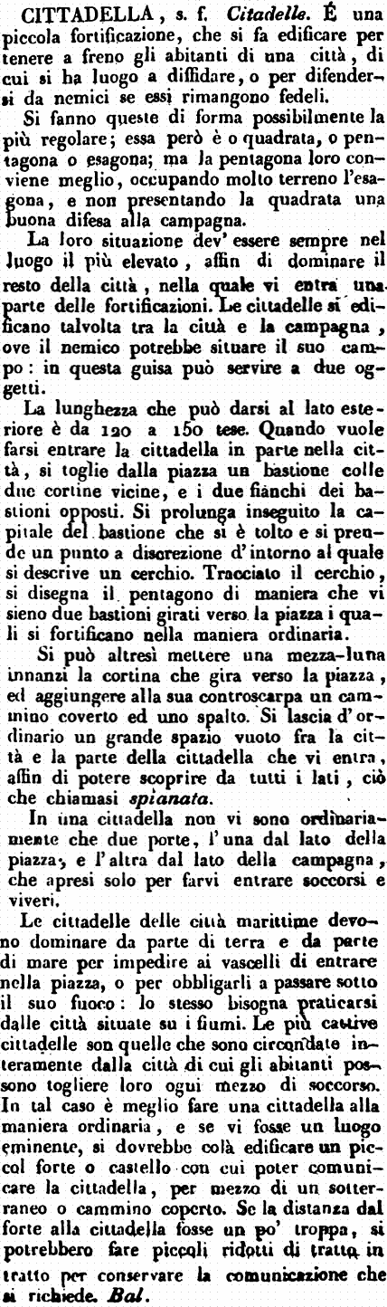 | Cittadella - s. f. Citadelle. É una piccola fortificazione, che si fa edificare per tenere a freno gli abitanti di una città, di cui si ha luogo a diffidare, o per difendersi da nemici se essi rimangono fedeli.