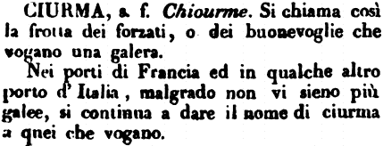 | Ciurma - s. f. Chiourme. Si chiama così la frotta dei forzati, o dei buonevoglie che vogano una galera.