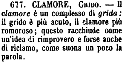 | Clamore, Grido - Il clamore è un complesso di grida: il grido è più acuto, il clamore più romoroso; questo racchiude come un'idea di rimprovero e forse anche di riclamo, come suona un poco la parola. [immagine] |