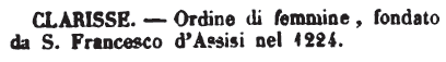 | Clarisse - [T.] Agg. f. pl. Suore dell'ordine di Santa Chiara. Monache clarisse.
