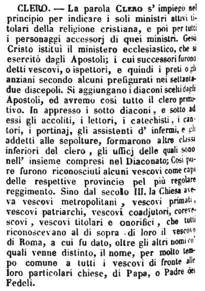 | Clero - La parola Clero s'impiegò nel principio per indicare i soli ministri attivi titolari della religione cristiana, e poi per tutti i personaggi accessorj di quei ministri. Gesù Cristo istituì il ministero ecclesiastico, che si esercitò dagli Apostoli; i cui successori furono detti vescovi, o ispettori, e quindi i preti o gli anziani secondo alcuni prefigurati nei settantadue discepoli. Si aggiungano i diaconi scelti dagli Apostoli, ed avremo così tutto il clero primitivo. In appresso i sotto diaconi, e sotto ad essi gli accoliti, i lettori, i catechisti, i cantori, i portinaj, gli assistenti d'infermi, e gli addetti alle sepolture, formarono altre classi inferiori del clero, gli ufficj delle quali sono nell'insieme compresi nel Diaconato; Così pure furono riconosciuti alcuni vescovi come capi delle respettive provincie pel più regolare reggimento. Sino dal secolo III. la Chiesa aveva vescovi metropolitani, vescovi primati, vescovi patriarchi, vescovi coadjutori, corevescovi, vescovi titolari e onorifici, che tutti riconoscevano al di sopra di loro il vescovo di Roma, a cui fu dato, oltre gli altri nomi co' quali venne distinto, il nome, per molto tempo comune a tutti i vescovi di fronte alle loro particolari chiese, di Papa, o Padre dei Fedeli. [immagine] |
