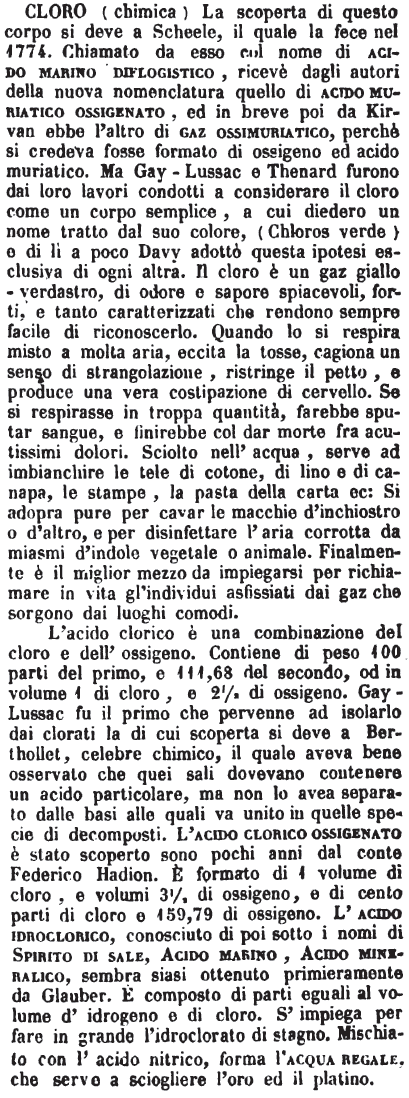 Cloro (chimica) - La scoperta di questo corpo si deve a Scheele, il quale la fece nel 1774. Chiamato da esso col nome di acido marino diflogistico, ricevè dagli autori della nuova nomenclatura quello di acido muriatico ossigenato, ed in breve poi da Kirvan ebbe l'altro di gaz ossimuriatico, perchè si credeva fosse formato di ossigeno ed acido muriatico. Ma Gay-Lussac e Thenard furono dai loro lavori condotti a considerare il cloro come un corpo semplice, a cui diedero un nome tratto dal suo colore, (Chloros verde) e di lì a poco Davy adottò questa ipotesi esclusiva di ogni altra. Il cloro è un gaz giallo-verdastro, di odore e sapore spiacevoli, forti, e tanto caratterizzati che rendono sempre facile di riconoscerlo. Quando lo si respira misto a molta aria, eccita la tosse, cagiona un senso di strangolazione, ristringe il petto, e produce una vera costipazione di cervello. Se si respirasse in troppa quantità, farebbe sputar sangue, e finirebbe col dar morte fra acutissimi dolori. Sciolto nell'acqua, serve ad imbianchire le tele di cotone, di lino e di canapa, le stampe, la pasta della carta ec: Si adopra pure per cavar le macchie d'inchiostro o d'altro, e per disinfettare l'aria corrotta da miasmi d'indole vegetale o animale. Finalmente è il miglior mezzo da impiegarsi per richiamare in vita gl'individui asfissiati dai gaz che sorgono dai luoghi comodi.