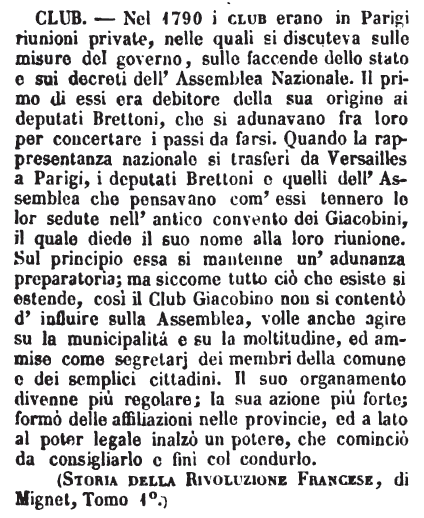 | Club - Nel 1790 i club erano in Parigi riunioni private, nelle quali si discuteva sulle misure del governo, sulle faccende dello stato e sui decreti dell'Assemblea Nazionale. Il primo di essi era debitore della sua origine ai deputati Brettoni, che si adunavano fra loro per concertare i passi da farsi. Quando la rappresentanza nazionale si trasferì da Versailles a Parigi, i deputati Brettoni e quelli dell'Assemblea che pensavano com'essi tennero le lor sedute nell'antico convento dei Giacobini, il quale diede il suo nome alla loro riunione. Sul principio essa si mantenne un'adunanza preparatoria; ma siccome tutto ciò che esiste si estende, così il Club Giacobino non si contentò d'influire sulla Assemblea, volle anche agire su la municipalità e su la moltitudine, ed ammise come segretarj dei membri della comune e dei semplici cittadini. Il suo organamento divenne più regolare; la sua azione più forte; formò delle affiliazioni nelle provincie, ed a lato al poter legale inalzò un potere, che cominciò da consigliarlo e finì col condurlo.